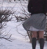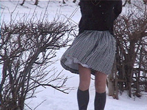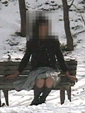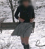 | 撮影はしませんでしたけど、この時純子はいろいろ変態的な苛め、というか辱め、を受けました。 映像にもありますが、冷たく冷え切ったベンチに座らされて...スカートを持ち上げて座らされたの。 太ももやお尻の肌が直接冷たいベンチに触れるのよ。その時のつらい感触をご想像下さい。思わず声が 出てしまいます。拷問の呻き声...それから、雪玉をスカートの中で太腿の間に挟まされました。全部が 溶けるまで風の中で立ったまま、みんなの好奇の視線に晒され続けて...その後は、雪を性器や会陰部に 擦りつけられました。寒い風の中でスカートもペチコートも捲り上げられてお尻を剥き出しにされ、スパンクパッドで 延々とお尻をぶたれました。太腿の前面も延々とぶたれました。赤くなり熱くなった肌に雪の冷たさが嬉しかった... |