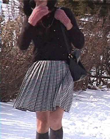 冷たい風と雪の中をプリーツミニスカート姿で公園に遊ぶ純子