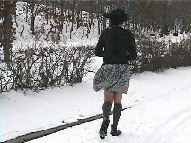 冷たい風と雪の中をプリーツミニスカート姿で公園に遊ぶ純子