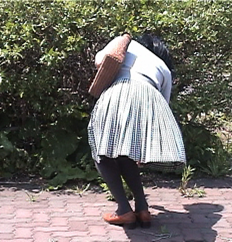 純子の映像としては珍しいポーズ...スカート姿で地面にしゃがみ込んで拾ったり摘んだりしたりするしぐさを撮影してみました。