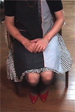 スカートは定番ギンガムチェックのプリーツミニです。黒の半袖ニット、ストッキングも黒です。靴は赤いハイヒール...