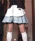 スカートは淡青色のフレアーミニです。スカートがかなり短い上に、さらに短いエプロンを重ねています。短かい上にフリルまで...