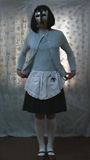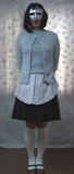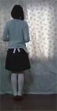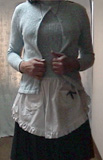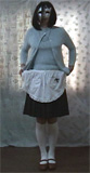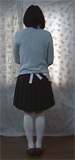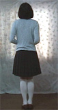 | ブルーのニットアンサンブルと合わせてみました。カーディガンがスカートにかかるため、特に後ろからスカートの上部が見えません。 上の写真でも分かりますが、そのため、純子の脚が短く見えています(実際の所、長くはないんです)。下のエプロンの写真でも... 普通ならここでうれしくなくなっちゃうんでしょうが、純子はとても満足しています。この方が、周りにいる女性と同じように見えるから... あまり脚が長く見えたりすらっとして見えるのは不自然で、エロチシズムが感じられません。これくらいの方が女っぽさを感じて頂けるのでは? |