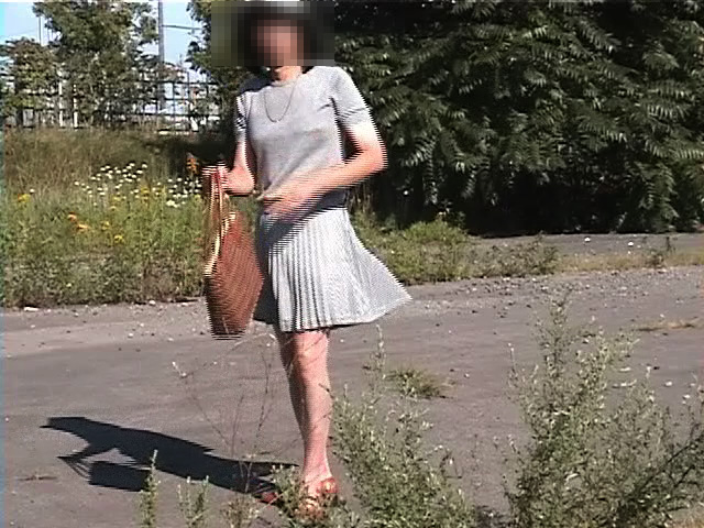 風で飛ばされた帽子を拾うプリーツミニスカート姿の純子