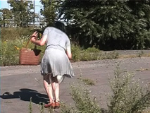 | 風で飛ばされた帽子を拾うプリーツミニスカート姿の純子 |