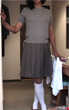 膝丈の幅広プリーツスカートに白いハイソックスをあわせる純子