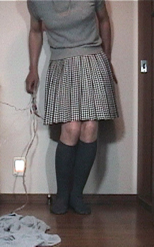 正面(カメラ)に向かって、壁際に立たされたスカート姿の純子です。いつものギンガムチェックのプリーツミニ...