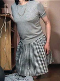 千鳥格子のプリーツミニスカートです。プリーツは幅広で、いちおう車襞の16本ですが、プリーツが比較的浅目に仕立てられています。裏地は黒、どちらかというとタイト気味なので、脚捌きがいいとは言えませんが、丈が短いのでまだ歩きやすいです。下着はスリップ1枚だけです。この撮影の時には、暑いのでストッキングも履いていないの!それなのに靴下留めをしているなんて... |