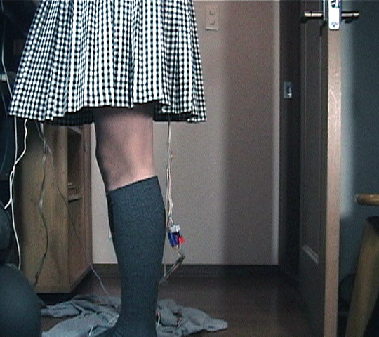 辛うじて姿勢を持ち直してキーボードに向かった純子です。スカート姿を...また電気鞭が狙っていました...