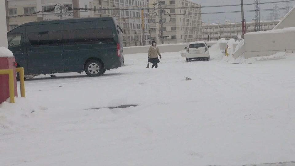 ショッピングセンターの屋上駐車場で吹雪の日に撮影しました。ただ雪が降るのであれば、とくにスカート姿で外に出ても、