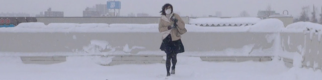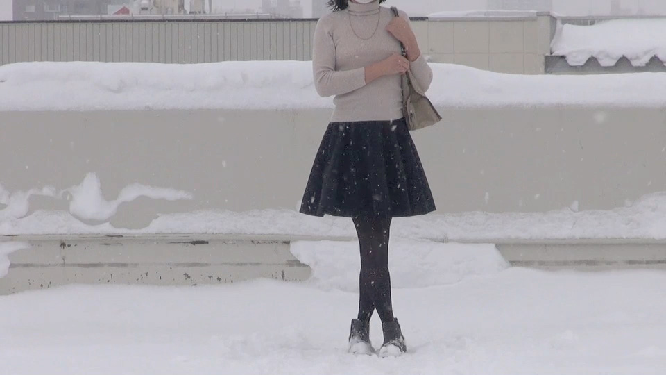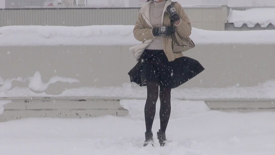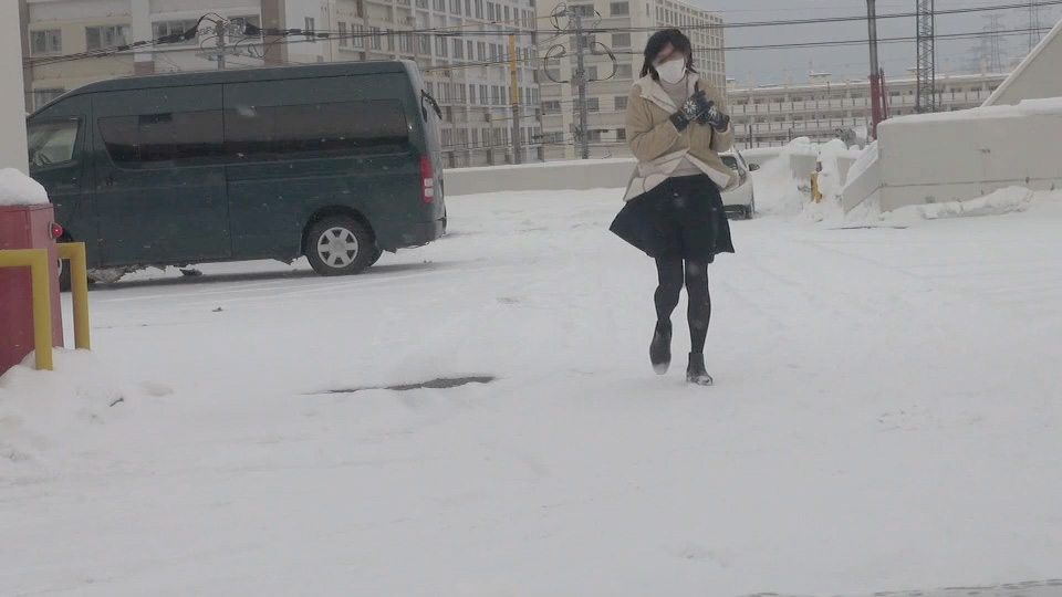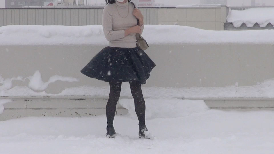 ショッピングセンターの屋上駐車場で吹雪の日に撮影しました。ただ雪が降るのであれば、とくにスカート姿で外に出ても、