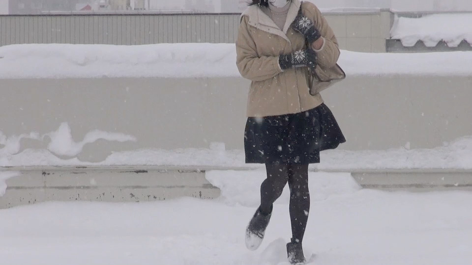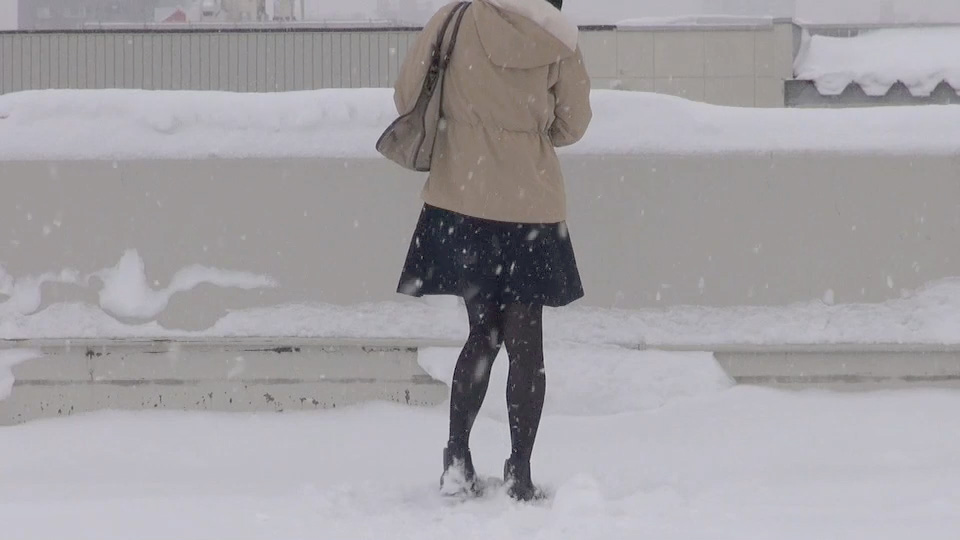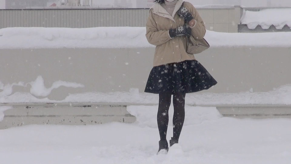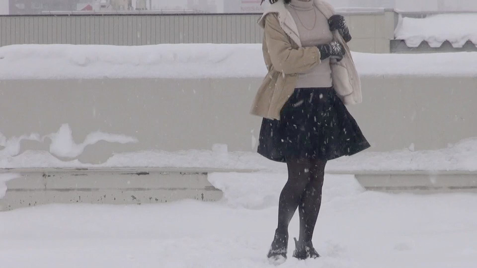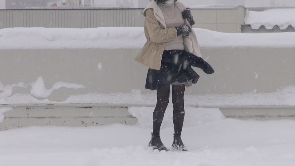 ショッピングセンターの屋上駐車場で吹雪の日に撮影しました。ただ雪が降るのであれば、とくにスカート姿で外に出ても、