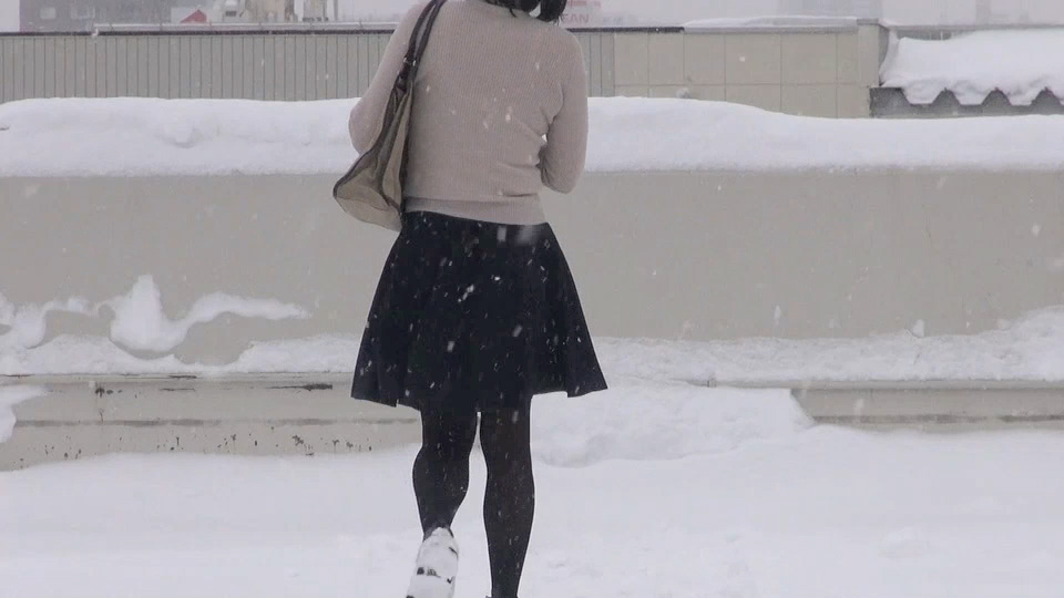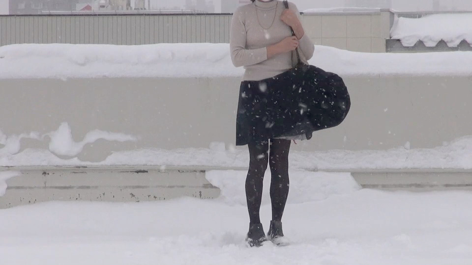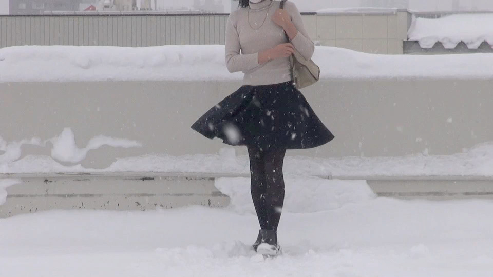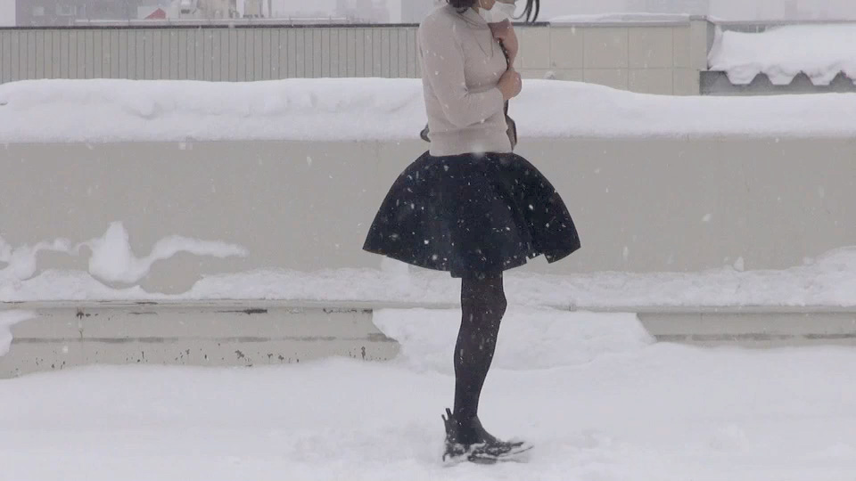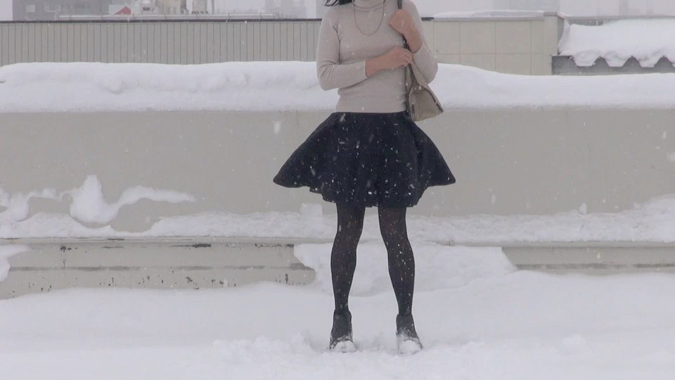 ショッピングセンターの屋上駐車場で吹雪の日に撮影しました。ただ雪が降るのであれば、とくにスカート姿で外に出ても、