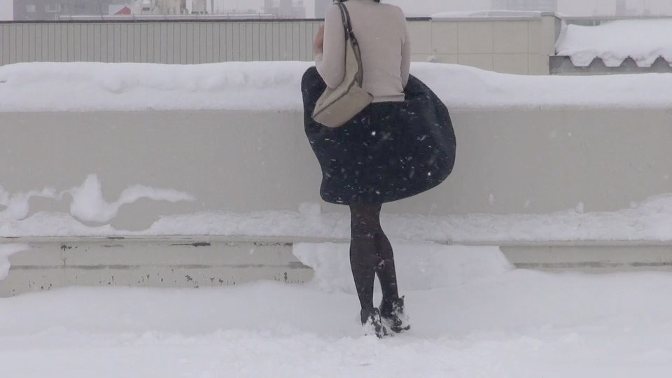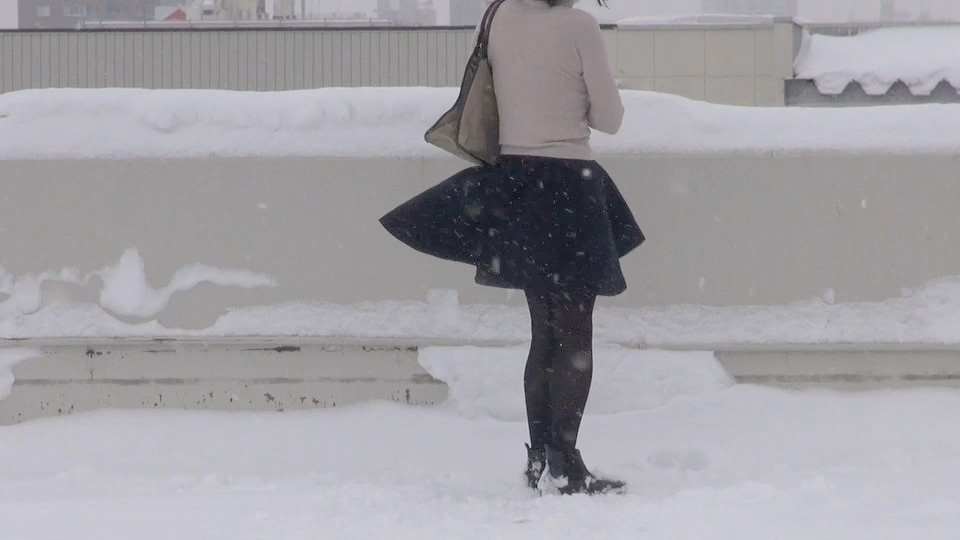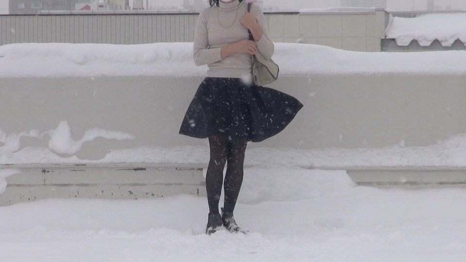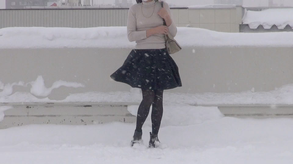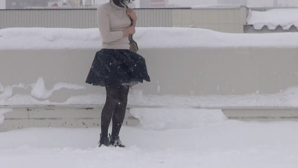 ショッピングセンターの屋上駐車場で吹雪の日に撮影しました。ただ雪が降るのであれば、とくにスカート姿で外に出ても、