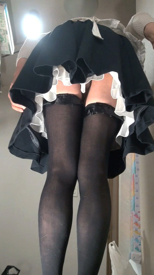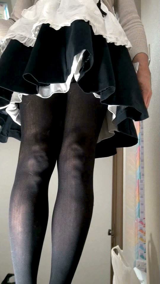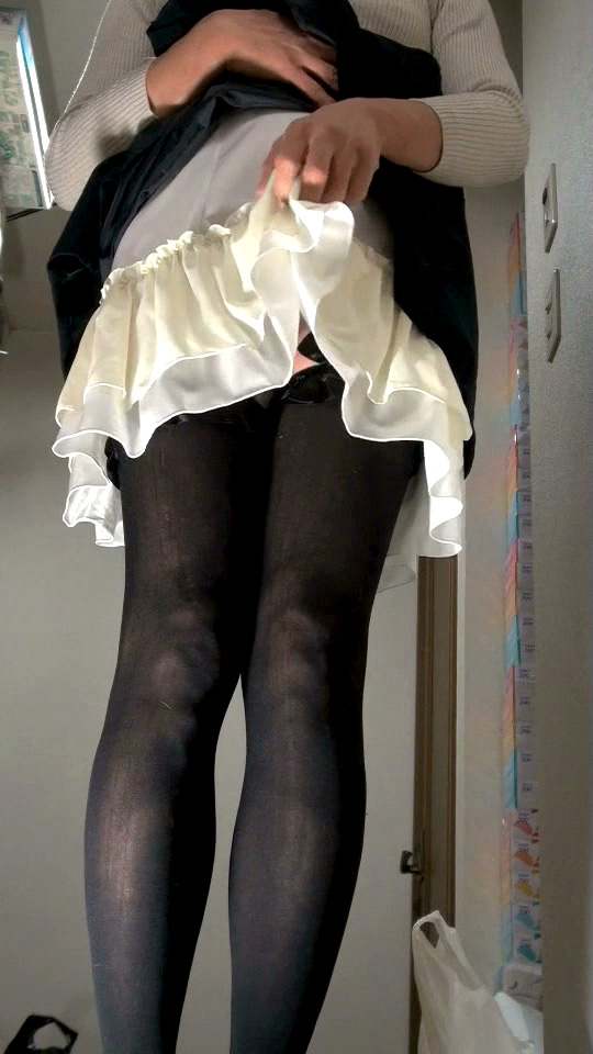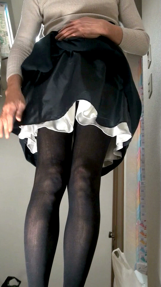 夜までふつうに仕事をして、帰宅してからスカート姿に変身し、食事して後片づけして簡単な台所仕事をして、その後の撮影です...昼間はもちろん男モードでした。 ![]() 紺のスカートに白いサロンエプロン...メイド風ですね。なぜか分かりませんが、メイドを思わせるこの色の組み合わせには、そこはかとないエロチシズムを感じます。 ![]() 今夜は少し高ぶっています。スカートを捲り上げて裏地を見せ物に...この裏地はしっかりとペチコートを守っています。2014年の3月のスカート生活では除去してあります。 ![]() スカートの下には2段仕立てのシフォンペチコートだけ...週日なので簡易バージョンのスカート女装です。パンティは着けていません。高ぶって剥ぎ取ってしまいました。 ![]() スカート生活もだいぶ慣れてきた頃ですが、どうしてこの夜こんなに高ぶったのか、今となっては分かりません...電車か地下鉄ですてきなスカートでも見たのかしら? ![]() 高ぶった純子のからだ、スカートを捲り上げてペチコートの上から慰めています。勃起したままじゃあまりにつらいから...手でやさしく揉んでシゴいて不満を慰めて... ![]() ペチコートってとても柔らかくてツルツルで、この上からペニスの亀頭やウラ筋や陰嚢を愛撫するととっても気持ちいい...ああ...射精も、って思ってしまいます... ![]() スカートを下ろしてしまえば、もう普通の女の子と区別はつきません。スカートの中にあんな醜い男根を隠しているなんて...しかもいやらしく勃起した醜悪な肉のかたまり! この日はストッキングをガーターベルトで吊るのではなく、サイハイの厚地のストッキングでした。特に靴下留めの助けは借りず、このストッキングのゴムだけで保持していました。 ![]() ちょっと動くとずり落ちてくるので、今、太もものところで直しています。スカートが持ち上がって白いペチコートが見えています。純子にはとてもエロチックな光景なの... ![]() そして反対側も。紺色だと白いペチコートがよく目立ちます。ストッキングの上の太ももの肌...やっぱり履いていても見ていても、パンストよりはずっとエロチックだわ... ![]() スカートの裾から伸びる脚に女っぽいニュアンスを演出してみました。モデルさんがファッションカタログでもよく取っているポーズ...駅や待合場所など実生活も目にjします。 ![]() スカートの後ろ姿...純子はお尻が貧弱だからあまりいい画像とは言えないわね。でもエプロンの結び紐がアクセントになってそれなりに「スカート」を思わせてくれる? ![]() スカートの裾が乱れて少しだけペチコートの白い色がのぞいています。こういうシーン、純子は大好きなの...昔の少女マンガやディズニーのアニメ映画みたい... スカート生活では被虐妄想と結びついた性的欲求を満たす必要がありますが、単なるオナニーだけでなく家事や仕事(在宅関係)などもこなさなければなりません。 ![]() 性的な快感を追い求めるだけでなく、それとはまったく関係のないことがらもスカート姿でしなければなりません。そんな状況が純子にはとても刺激的でした。 ![]() 日常生活の中でのスカート姿こそ純子が夢見ている状況です。オナニーするためにスカートを穿くのではなく、スカート姿の時にふとオナニーしたくなる、という状況... ![]() スカート姿で生活していて、時に性欲が昂じて自慰行為に耽り、寸止めあるいは射精の後にふつうの生活に戻る...ズボン姿は許されず...それこそが純子の理想です。 撮影を始めた時にはカーデガンを羽織っていました。カメラも最初はローアングルでした。この服装と条件で10分ちょっとくらい撮影を続けました。撮影を開始してまもなく、カーデを脱ぎました。 ![]() この上下の画像は、純子が靴下を直しているところです。サイハイストッキングを靴下留めなしで履いているため、時々引っ張り上げてやらなければなりませんでした。恥かしい格好で... ![]() そして撮影を始めた時には、それまでの普通の生活(食事、後片づけ、洗濯?)の延長でしたのでふつうのパンティ(ナイロンの白いスキャンティでした。クロッチ部はコットン)を着けていました。 ![]() 紺色のフレアーミニスカートの裾からは白いペチコートがのぞき、黒厚手サイハイストッキングに包まれた脚が伸びています。カメラを意識して脚でいろいろなニュアンスを演出してみました。 ![]() からだを揺らせてみました。スカートが乱れ、ペチコートの白い色が目を射抜きます。そして時々見えるストッキングのストッキングの上の太ももの肌...柔らかいこの部分が攻撃の目標ね... ![]() このペチコートは裾にレースが施されてなくてメロー仕上げになっています。最初はちょっとさびしい気分でしたが、馴れるとチリチリに丸くなったメロー仕上げも好ましいものに思えるようになりました。 ![]() この撮影の時にはスカートには本来の裏地がまだ付いていました。クルット回った時、横から見ると裏地が邪魔をしてペチコートは見えないので