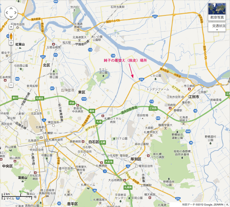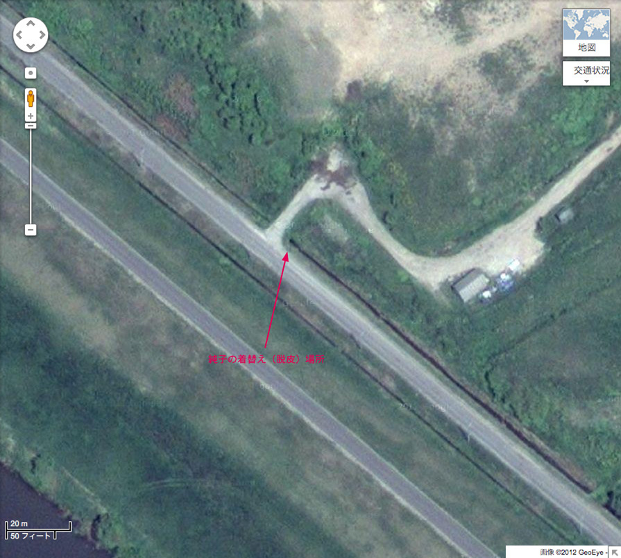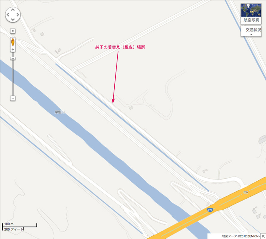 | この日、天候は晴れ。朝早いうちは涼しいだろう、と楽観していたのですが、町中を抜けて着替え予定の場所に着く頃には、 もはや猛暑でした。着替えそのものは、倉庫で済ませてから、スカートの上にズボン、トップスはワイシャツという格好で、着替えの 場所に向かいました。町中を抜けてここに着くまで約1時間...ここは、隣の市の郊外にあたる場所で、川の土手下を走る直線 道路です。車はほとんど通らず、人や自転車はまず通りません。遠くまで見通せるので、着替え中に車が来たら、自分の車の中に 逃げ込むつもりでした。上を着替えてからズボンを脱ぎ、スカート姿で靴を替えるまで、幸いなことに通りかかる車はありませんでした。 純子が通った道は、国道275号線。この国道は札幌市から、道北オホーツク海側の浜頓別という町に至る長い道で、途中まで、 JRの札沼線というローカル線に沿って走ります。この地図で、「学園都市線」とあるのが札沼線で、当初は札幌から石狩沼田まで 行っていました。今は、新十津川までで、浦臼という駅までは一日に7,8本の往復ですが、浦臼より先になると、一日3往復です。 このことを失念していたため、今回、ヒヤッとすることがありましたが、多くは無人駅で、スカート姿での撮影が可能と踏んでいました。 ![]() 上の地図、右上を横切って流れる川は、北海道第一の石狩川、中央を流れて石狩川に合流するのは、札幌市街地を抜けて流れる豊平川です。 ![]() 純子がスカート姿に脱皮したのは、石狩川と豊平川が合流する低湿地帯を開墾して開かれた農業(酪農)地域です。豊平川に合流する厚別川沿いの道... ![]() 275号線から信号を左折して厚別川沿いの道に入り、途中で折り返して停車しました。パークゴルフ場には多数の人や車が集まっていましたが、彼らが奥に来る理由はありません。 ![]() この道はこの先、石狩川で行き止まりです。レジャーで来る所でもないので、車や人が通りかかることはまずないと踏みました。裏に作業場がありますが、日曜だから人の出入りもないはず... ![]() 国道からこの道に入って、進行方向を見ています。ここで折り返して停車し、スカート姿に脱皮しました。人気はありません。 ![]() 来た道を見ています。ズボンを脱いでスカート姿になり、ワイシャツを脱いでサマーニットに着替えました。靴もパンプスに... ![]() 川沿いの道から中に入る道。この先に航空写真に出ていた作業場があるはず。純子はスカート姿が嬉しくて、歩き回りました。 ![]() 堤防上にも道があるはずですが、誰も通りませんでした。久しぶりのスカート姿...風の音と鳥の鳴き声だけが聞こえていました。 |