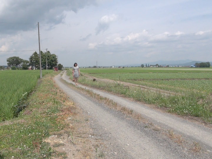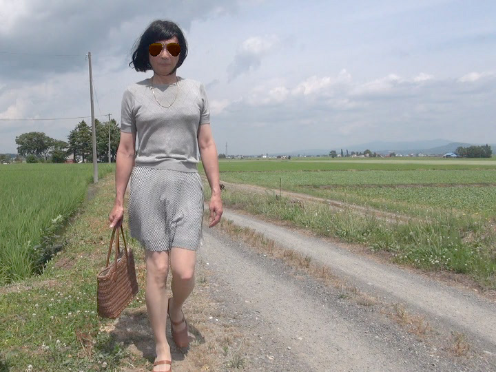 空のどこかで鳴く鳥の声と田んぼを渡っていく風の音だけ...高い青空だけど雲が出ているおかげで直射日光はなく、ほんとに気持ちのいい天気...そして風に乱れるプリーツスカート...