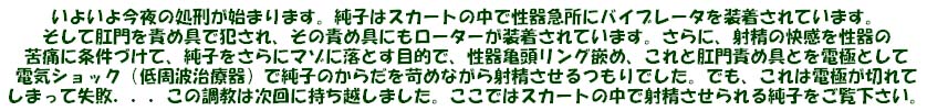 スカートの上から、前のバイブレーターのスイッチを入れる純子です。ブーンとつらい刺激が性器の先端をいじめ始めました。