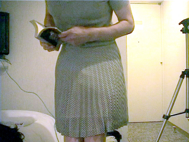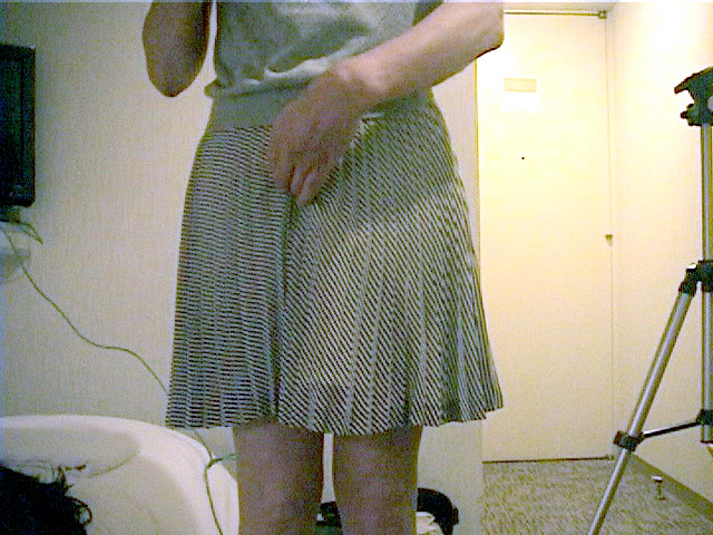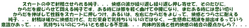 からだを捩って射精の快感とつらさに耐えるスカート姿の純子です...何もかも、瀟洒なスカートの中に隠されて...