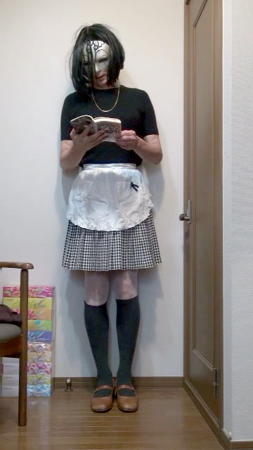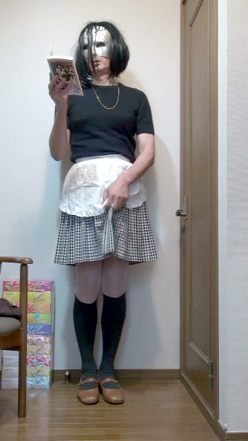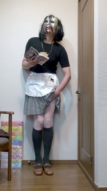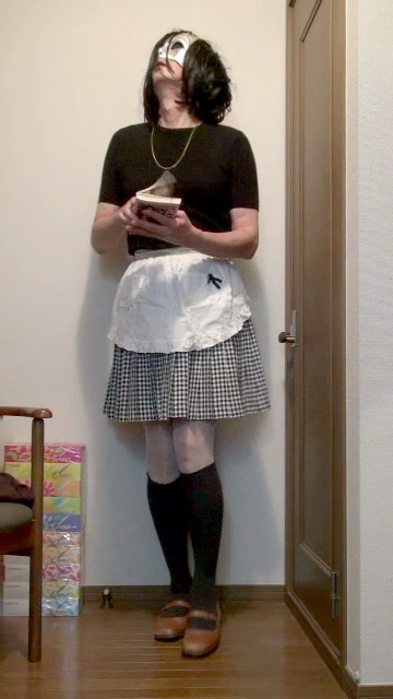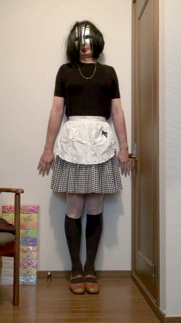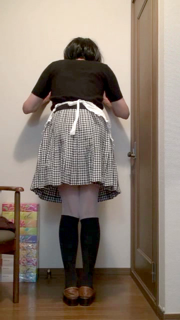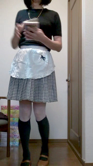 ギンガムチェックのプリーツミニスカートの上に白いエプロンを着けて家事に勤しむ純子です。エプロンのガーリーな雰囲気が大好きです。