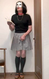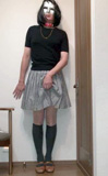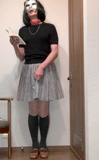 立たされて、エプロンを剥がされ、スティックでスカートをつつかれ、太ももをぶたれ、スカートを捲り上げられて