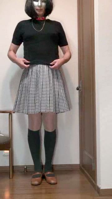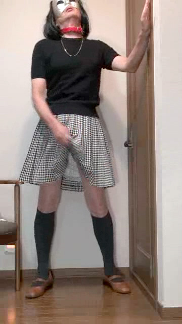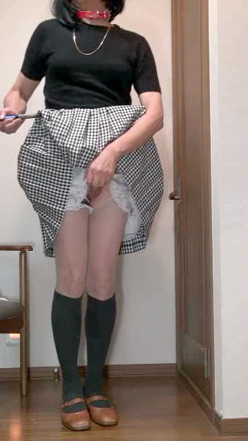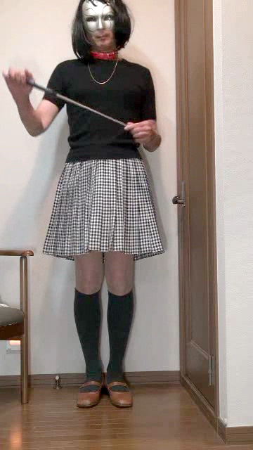 立たされて、エプロンを剥がされ、スティックでスカートをつつかれ、太ももをぶたれ、スカートを捲り上げられて