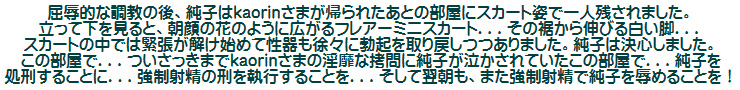 下の写真は、kaorinさまがお帰りになってから調教を思い出して興奮し、スカートの中の性器に淫具を嵌めて強制射精させるようすです。恥ずかしい映像...