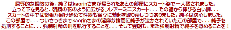朝起きてすぐにスカート姿に着替えさせられ、さんざん嬲られ、苛められ、辱められた挙句に、射精させられる...