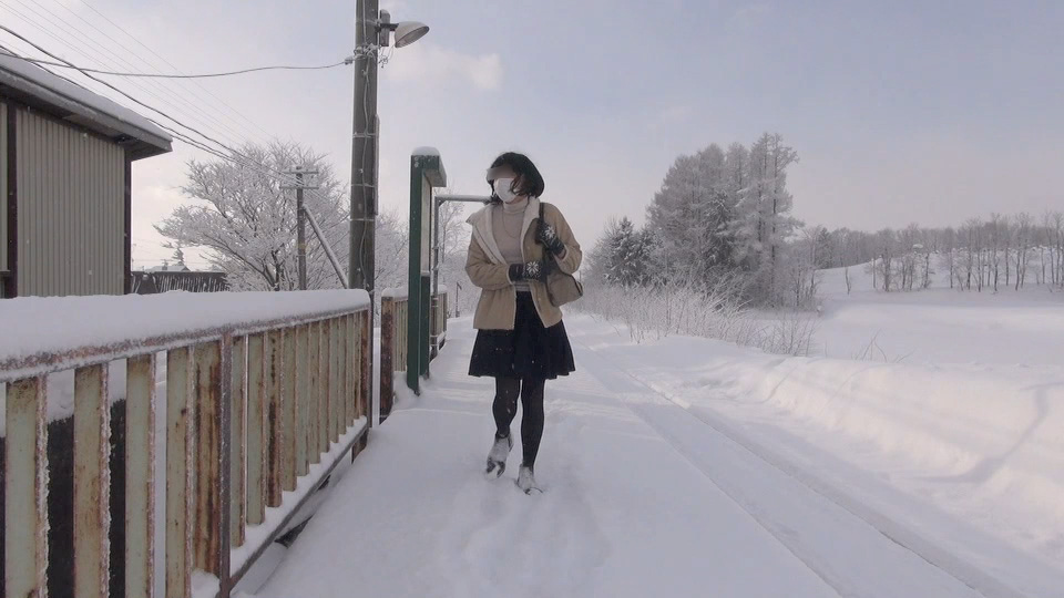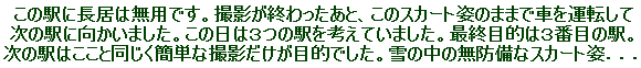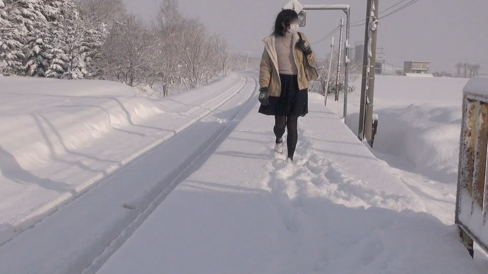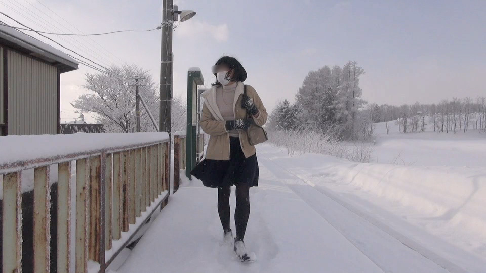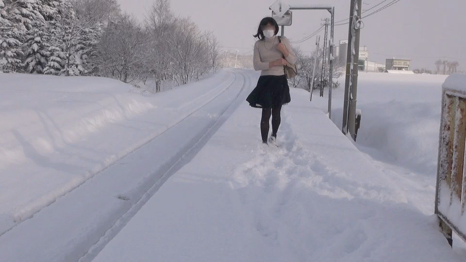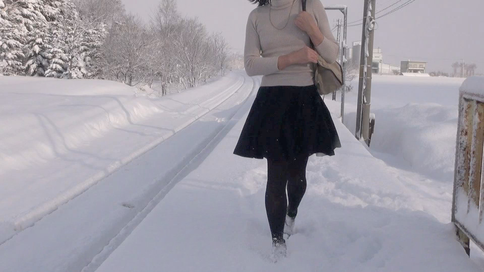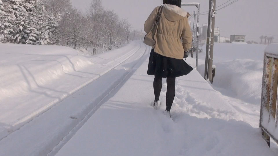 歩ける程度に雪深いローカル線の無人駅をスカート姿で歩きます...昨夜来積もった上に、今も断続的に降り続いています。