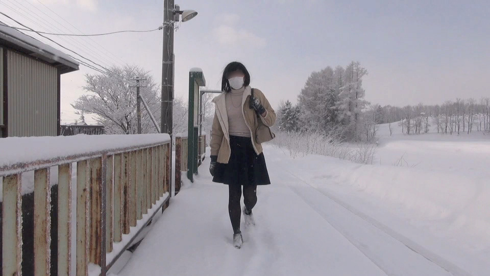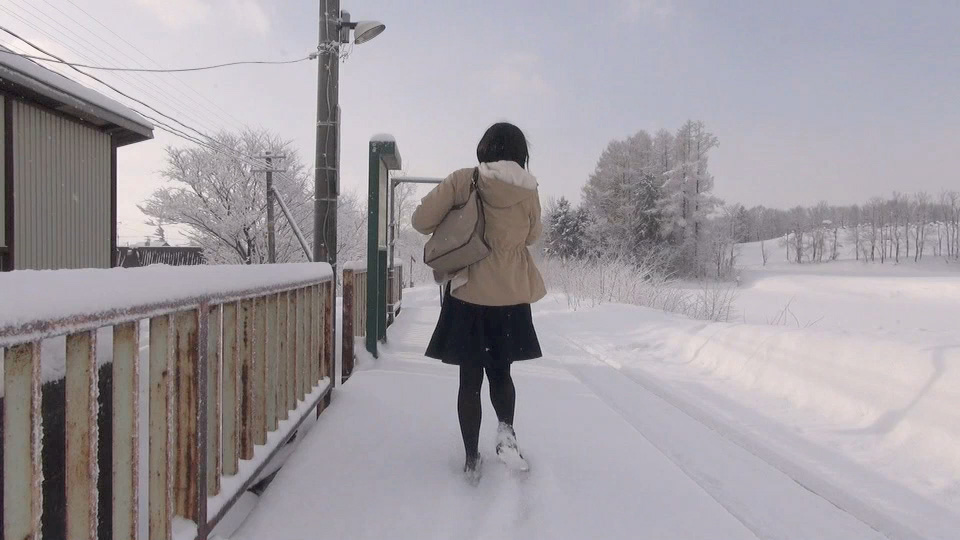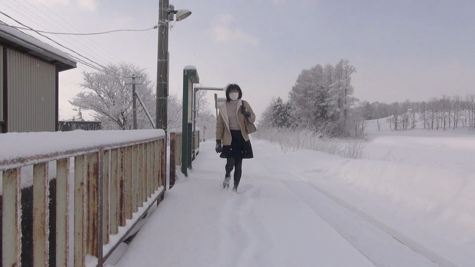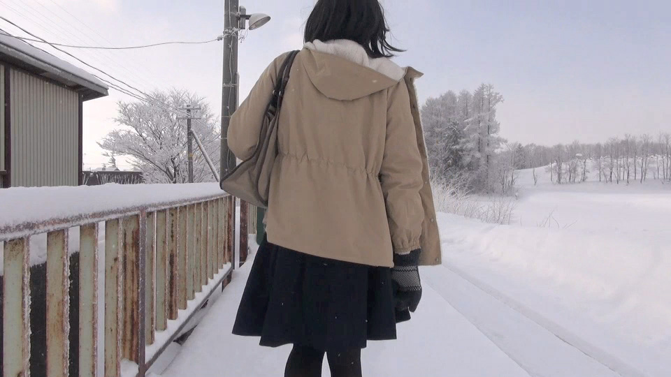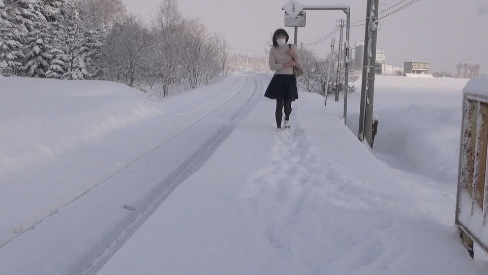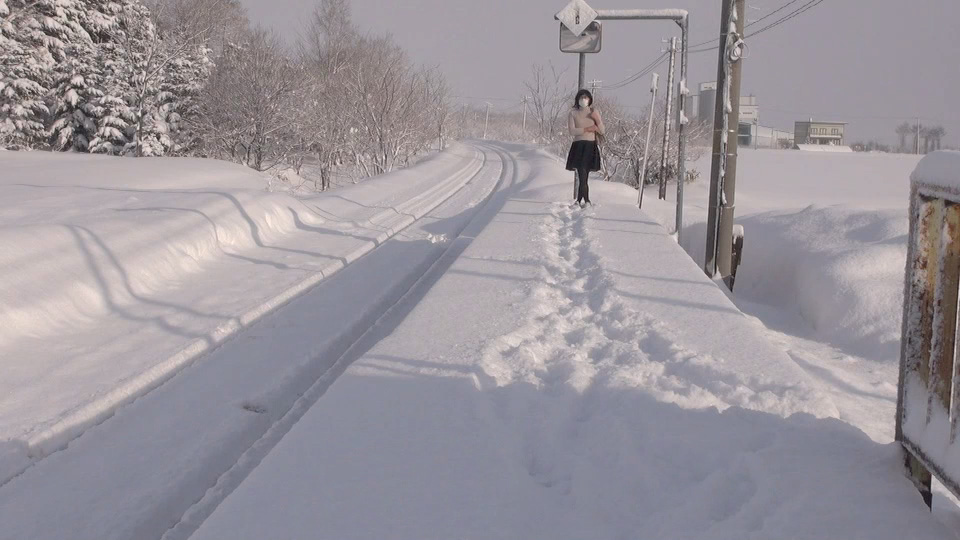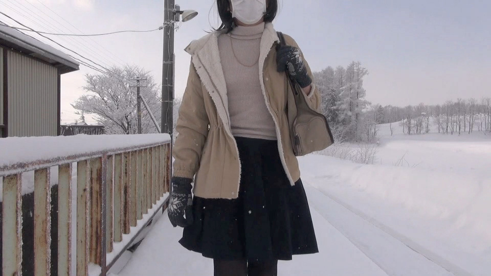 歩ける程度に雪深いローカル線の無人駅をスカート姿で歩きます...昨夜来積もった上に、今も断続的に降り続いています。