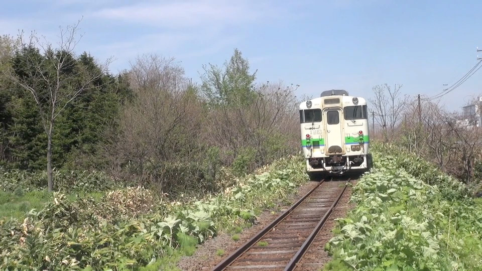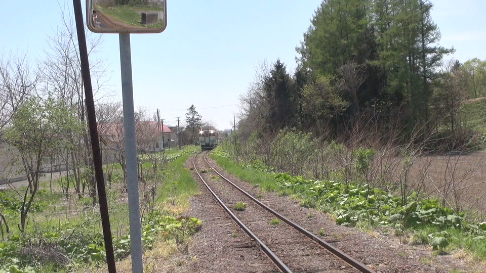 ワンマン車両のドアが閉まり、ホームには確実に誰もいないことになったので、移動し、遠ざかる列車を写しました。スカート姿で...遠くでは農作業の人が...