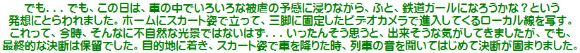 それは想定外の可能性でした。純子は祈るような気持ちで、そこで待ちました。乗客は確かに見えます。降りるか?降りないか?車内アナウンスが聞こえました...
