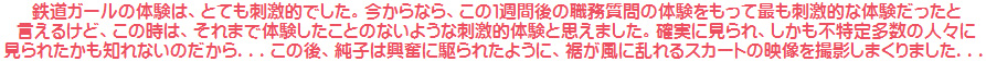 駅前での純子です。ここから後ろに見えるホームに上がりました。風が強いので、スカートが翻ってしまって...裾が乱れて靴下留めやガーターベルトの留め具が見えないか心配でした。
