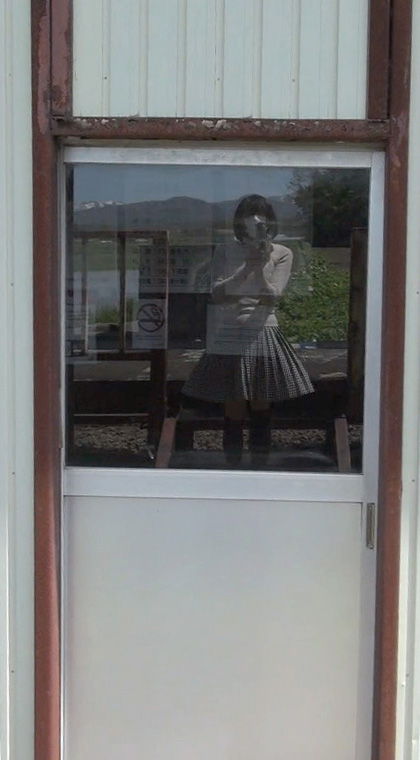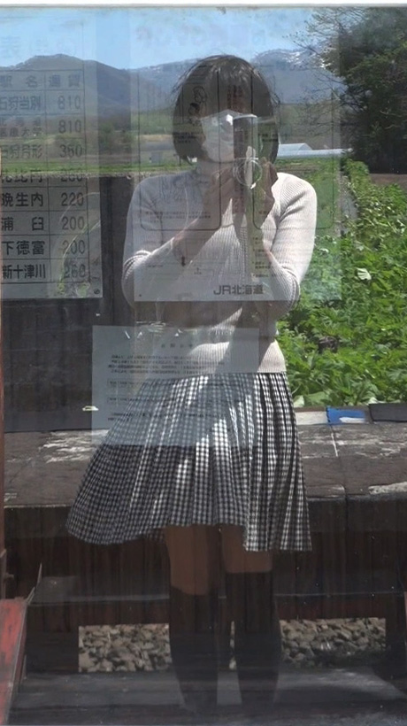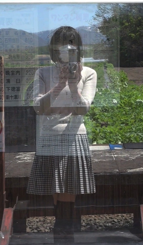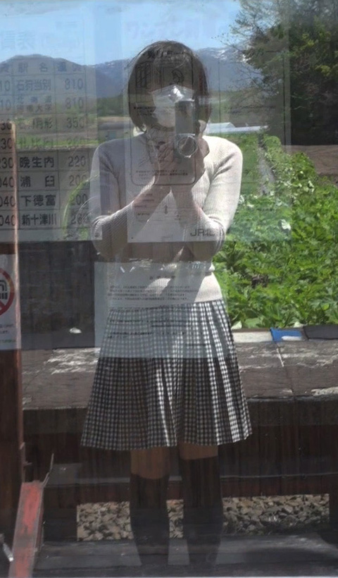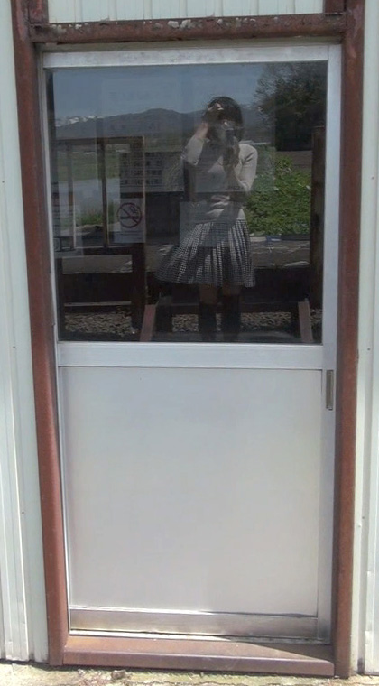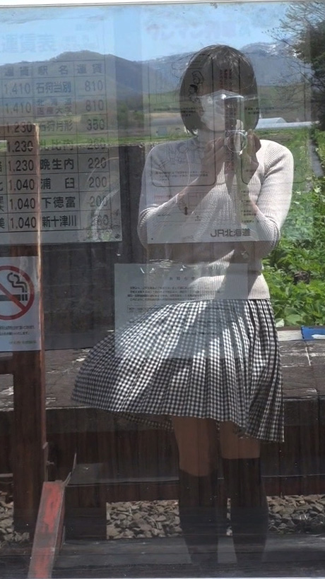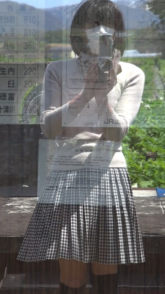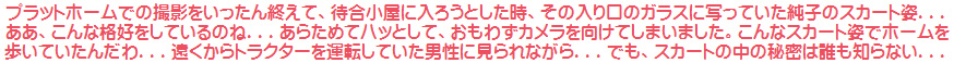 でもまだよ。もっとスカート姿で探検してみましょう!この待合小屋にはトイレもあるはずだし、ホームを歩く純子のスカート姿を、少し離れたところからも撮影したいし...