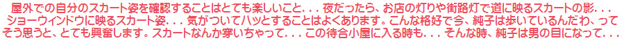 スカート姿で歩く待合室。いつ誰が来ても不思議ではない駅の待合室...そんなスリルもたまりません。スカートの中で純子のからだがキューンとなっています。ああ...