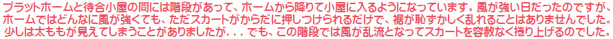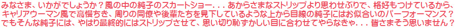 プリーツミニスカート姿で立たされている、という妄想に耽っています。どんなに風がスカートを乱そうと、決して直してはいけない、というご命令で...![]() 小屋の中から人々が純子のスカートが乱れる様子を楽しんで見ています。いつ、どんなふうに捲くれ上がるのか?下着は何色?どんな下着? ![]() こうしてギャラリーに展示するということは、小屋から見られているのと同じ情感に...被虐の情感に浸るため...いやらしい目で見られたい... ![]() 久しぶりに着けたガーターベルト...スカートがめくりあがって留め具が見えてしまっています。靴下留めは、なくてもいいものですが、秘密のおしゃれです。 ![]() スカートが腰まで捲くりあがり、グレーの二段仕立てのペチコートの裾が広がってしまいました。その下の白いプリーツペチが見えてしまっています... ![]() 容赦ない風の意地悪...スカートをむちゃくちゃに捲り上げられる純子...とても気持ちいいんです...恥ずかしさと風の感触...スリルと背徳の気持ち... ![]() パンティは股割れパンティ...性器がスカートの下で剥き出しになっています。風でスカートが揺れると、性器の先端が擦れて...とても気持ちいいの... ![]() 後ろを向くように命令され、スカート姿のお尻を観察されることに...どんな風にスカートが乱れているか、自分では分からないのでとても恥ずかしい... ![]() 屈み気味になってスカートのお尻を突き出します。どうぞ...どうぞ笞でぶって下さい...こんな変態女装の純子をきびしくお仕置きして下さい... ![]() 自分でも、からだの感覚でスカートが大きく乱れているらしいことは分かります。でも、その中が...下着が...どんな風に見えているかは分かりません。 ![]() スカートのすぐ下のこのペチコート...二段仕立てで、裾上20センチくらいだけ二枚重ねのフレアで、その上はヒップを包むようにタイトなデザインです。 ![]() ああ...風が止んだみたい...スカートが下に落ちて戻る感覚で分かります。まだスカートの乱れはあるけど、太ももに触れ始めたから...でも、また... ![]() ここまでの動画はこのボタンを押してダウンロードして[ご覧下さい。 kaze_no_ijiwaru_L1.mov 脚を開くよう命令された純子です。剥き出しになった純子の性器...剃り上げた陰嚢にスカートの揺れがペチコートから伝わって、とても淫靡な気持ちです... ![]() ああ...撫で上げられる陰部...自分の手で嬲るのとちがって、いつ触れられるか、どんなふうに触れられるかかが、まったく分からないから...つい声が... ![]() 両脚をきちんと揃えてスカート姿で立つ純子...太ももも揺れるスカートの感触を感じています。純子のスカートの中で、これが一番風に弱いスカートです... ![]() ああ、スカートが...急に純子のスカートを襲った風...下からねじ上げるように吹き上げる意地悪な風...純子はあわてて押さえていた手を離します... ![]() そうです。逆なんです。ふつうは映画のようにスカートが捲くれるのを手で抑えるのですが、純子にはそんなことは許されていないのです。おもちゃにされる純子です。 ![]() スカートが容赦なく捲り上げられ、恥ずかしいペチコートやガーターを見られる純子。でも、このペチコートは、純子のパンティはしっかりと守ってくれました。 ![]() どんなに風が意地悪く純子のスカートにあたっても、今回の撮影で、純子のパンティが見えてしまうことはありませんでした。ペチコートのデザインのおかげですね♪ ![]() スカートを整えて、いったん車に戻ります。遠くから見る人がいても、きちんとしたスカート姿ですから、怪しまれることはないはず...女性に見えるはず... ![]() 後半の動画はこのボタンを押してダウンロードして[ご覧下さい。 kaze_no_ijiwaru_L2.mov ![]() |