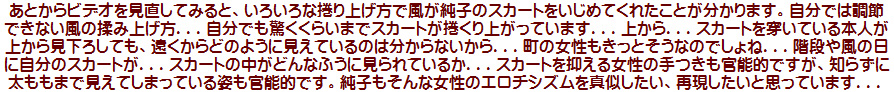 風はあたかも純子を辱めるように意地悪くスカートに当たります。その動きが純子のからだを刺激するから...