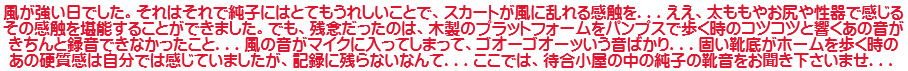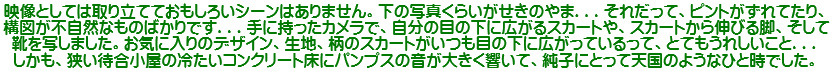 ごめんなさい、skirtsittingさま...この時はつい無意識にそのまま座ってしまいました。周囲に警戒心を集中させていたから...誰か入ってきたら、純子、終わりだから...