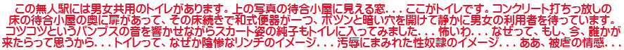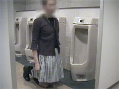 便器とスカートで思い出した昔の写真...スカート姿の純子が、男便所の床にひざまずかされ、これから開始される陰惨なリンチを待っています...