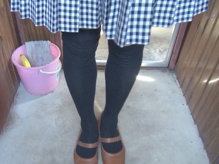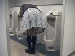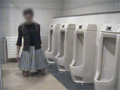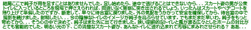 でも、結局、決心はできませんでした。こうしてカメラに向かって立っていても、外の気配が気になってしまうくらいだから...スカート姿で便所は危険と判断しました...