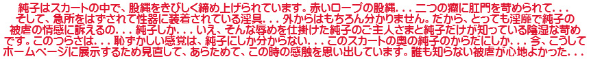 便器のすぐ横には、清楚なスカートとその裾から伸びる脚...スカートの裾が広がって...純子は陰惨なリンチを思っています。便器とスカート...