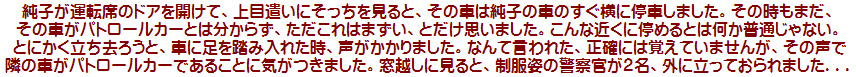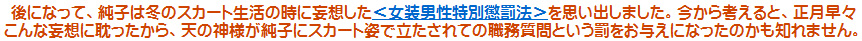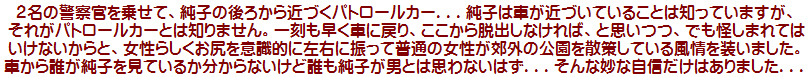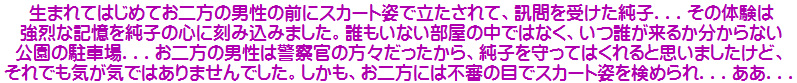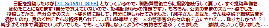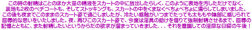 純子の処刑の時間となりました。あまり焦らして苛めすぎると射精の時間が遅くなり、今日もう1回強制射精させる予定ができなくなってしまいます...だからここで1回... ![]() 動画ページへは上のボタンをクリックして下さい。 前からの計画通りこの射精では、純子が友人のSに屈辱的な調教を受けるという妄想に耽って、せりふを入れられる音声ファイルを再生して、手淫での射精を目指しました。 ![]() ひざまずかされた純子の前に転がっているのは、今回のスカート生活初日に純子のお尻を辱めていた淫具です...犯されて...装着バイブで肛門を辱められた忌まわしい淫具... ![]() Sの許しもなく純子は早々とイッテしまいました。Sのせりふを聞きながらも、目の前にはさっきの公園でのスカート姿での職務質問の光景がまざまざとよみがえって... ![]() 夢中でシゴイているうちに、スカートに精液がついてしまいました。手も濡れて光っています...まだ射精の快感の余韻に浸って呆けている純子です...あの恥ずかしさの余韻... ![]() 動画ページへは上のボタンをクリックして下さい。 ![]() また職務質問を受けたい...スカート姿で立たされて...あるいは、署に連行されて取調室で...あるいはそこまで行けなくても、停まったパトロールカーに 乗せられて車内で訊問される...その時は、狭い室内に座るから、スカートの裾が乱れないように気をつけなくっちゃ...根掘り葉掘り訊かれて...正直に 答えさせられる純子...免許証も車検証も検められ、記録され、容赦のない車内検査と所持品検査を受ける純子...でも、警察だから、犯罪でない限り、 プライバシーを暴露されることはないでしょう。担当の警察官だけが純子を...スカート姿の純子を取り調べて記録する。それなら、また、って思います。 |