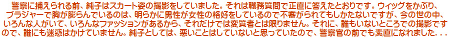 動画ページへは上のボタンをクリックして下さい。 性欲が...射精したいという欲求が高まってきました。職務質問を受けた時の恥ずかしさがよみがえってきて...鏡に自分のスカート姿を 写して恥ずかしさを噛みしめました。ウィッグはつけていましたが、この顔で...このゴツゴツの脚で...スカート姿をじっくりと観察された... スカート姿で駐車場に立たされて、風にスカートが乱れる中、質問というか尋問され、所持品検査をされた...このスカート姿で免許証を手渡し、 名前を確認され、勤め先を言わされ、何をしていたかを言わされた...こんな恥ずかしいスカート姿で...お二人の警察官の前に立たされて... そんなことを思い出しながら、靴底を拭いて室内での撮影のために履き、カメラをセットして撮影ボタンを押しました。カメラの前に立って、純子の口から その日あったことを報告させました。つい3時間ほど前の純子の屈辱の体験を自分の口から言わせ、みなさまに報告させるために撮影記録しました... ![]() 純子のスカートの裾は見られたかしら?純子の胸のふくらみはどう思われたかしら?男のくせにブラジャーをしているなっ、この変態!って思われたのかしら。 化粧はしてないけど、スカートの中の下着はどうせ女物を着けているんだろうな、生脚か?いや、履いてるな。これはパンストか?それともガーターベルトか?変態! どんな風に思われたのか、とても気になります。少しでも警察官の方々の性欲を刺激できていればとてもうれしいけど...少しでも好奇と欲情の目で見られていたら とても幸せだけど現実にはきっと、ただ軽蔑されただけ...犯罪とつながりそうもない変態老人の女装...係わり合いにならないよう無視されただけの純子です... |