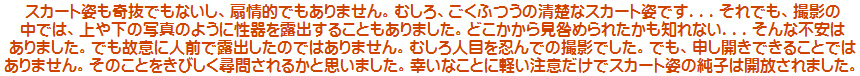 もともと、郊外の公園で純子には射精させてもいいかな、って思ってました。でも、公園ではそれどころではなくなってしまって... かろうじて撮影の続きを行ってそのまま逃げるように帰って来ました。そして、公園の時と同じスカート姿で、カメラからPCに画像を取り 込んで日記を更新した後で、エプロンをして昼食(といってもカップ麺...)を用意して食べ終わると、なんか一段落した気分になりました。