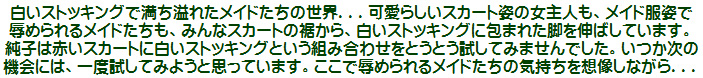 ![]() これは主人公格のメイド、クレアです。メイド服のスカートが乱れて、白いストッキングをガーターベルトで吊っている様子が明らかです。 ![]() ここでは後編だけをご紹介します。前編のハイライトはこれらの絵でどうぞ... ![]() クレアのご主人様であるキャロルは大富豪の娘。メイドも含めて大邸宅を支配します。今、執事役の男に鞭打たれて折檻されているのは、 もとはキャロルの友達だったリズ...彼女はメイド、いえ、性奴隷に落とされ客を取らされます。その時の粗相をキャロルにとがめられ、 こうして懲罰を受けています。クレアは、いわば女中頭格で、キャロルにリズを許してくれるよう懇願しますが、キャロルは許しません。 彼女は意地悪くメイドたちを調教して男客たちを満足させられるよう訓練します。リズはストッキングとガーターベルトだけに剥かれて 手には拘束具を嵌めらて天井に吊り上げられ、ヒップを鞭打たれます。その様子を見るスカート姿のクレアとキャロルです... ![]() キャロルにリズを許すよう懇願するクレア。それを許さないキャロル。二人とも、白いストッキングをガーターベルトで吊っています。 ![]() キャロルはこんな膝丈ほどの裾広がりの赤いスカートを着け、白いストッキングを履いています。でもこれはタイツではありません... ![]() 執事役の男に抱きしめられ、キスされるキャロル。赤いスカートの裾から伸びる白いストッキングに包まれた脚... ![]() メイドたちが裸にされ、男客たちに嬲られるショーを監督するキャロル。赤いスカートの裾から白いストッキングの脚が見えています。 ![]() リズがはじめて客を取らされる日。リズも青いメイド服の下で、白いストッキングをガーターベルトで吊っています... ![]() キャロルは脚を高く組んで座りながら、友達のリズがこれから犯され、辱められるところを微笑みながら観察するのです。 ![]() 女の子たちの白い脚が印象的です。リズはお口で男客の性的欲求を満たすよう強要されています。キャロルはそんなリズを見ています。 ![]() リズは後ろから犯されています。いえ、これから犯されるところ...執拗な出し入れでリズは経験したことのないからだの感覚に溺れます。 ![]() 腰をつかまれうしろからて犯されるリズの白いストッキング...それを意地悪く見つめるキャロルは白い脚を高く組んで...太ももが... ![]() リズ...メイド服のまま犯され辱められるリズ...スカート姿の友達キャロルの目の前で...キャロルの命令で... ![]() そんなリズを見つめるキャロル。いい気味だわ...もっともっと辱められればいいんだわ。脚を組み直して、リズの凌辱ショーを楽しみます。 ![]() 友人キャロルの姦計に嵌まり性奴隷に落とされるリズ。そのストーリーはこちらでどうぞ... ![]() 男と寝ているキャロルの部屋に食事サービスに来たクレア。男とクレアが愛し合っていることを知っているキャロルはクレアを許せません。 ![]() クレアは男に失望して酒に逃げ、それを諌める男に抱きついてしまいます。青いメイド服に白いストッキング姿で... ![]() その様子を盗み見るキャロル。嫉妬が彼女を狂わせます。女主人が女奴隷を罰するとき、どのような責め折檻があるでしょう? ![]() キャロルの頭の中には、女性にとって耐えられない屈辱をクレアに与えてやろうという怒りが満ちていました...輪姦されるクレア... ![]() クレアは仕事だと言われて、冷たい地下室に連れて行かれます。赤いドレスと青いメイド服...そこでクレアを待っていた客たちは... ![]() クレアはキャロルの陰湿な復讐を悟りますが、時すでに遅く、この冷たい地下室でクレアの凄惨な陵辱ショーが繰り広げられます。 ![]() クレアは3人の男客たちに輪姦(まわ)されます。最初はお口を弄ばれ、舌を要求されるクレア...訓練はできているけど... ![]() 仕事としてでなくキャロルの復讐...意地悪のために輪姦されるのは、クレアにとってとっても口惜しいこと...ああ、みじめだわ... ![]() 輪姦(まわ)されるクレアは、青いメイド服に白いストッキングと赤い靴...服はやがて剥ぎ取られ、下着だけの姿で辱めを受けることに... ![]() お口を汚されたクレア。この頃には、さんざん輪姦(まわ)されて、クレアのからだはすっかり興奮しきっています。目もうつろなクレア... ![]() 犯されて性的興奮の絶頂を何度も極めさせられるクレアの顔やからだをじっくりと観察する意地悪なキャロルの目...いい気味だわ... ![]() しかしキャロルの実家が事業に失敗し、メイドたちは解放されることに。キャロルは執事役の男に調教される様子をリズに見せられます。 ![]() リズは友達のキャロルを今も信じています。男にひどいことをしないよう懇願するリズの横で、キャロルは嬲られて行きます... ![]() 後ろ手に縛られ、胸を剥き出しにされて嬲られるキャロル。容赦なく辱められるところをリズに見られる屈辱...下克上のくやしさ... ![]() キャロルに許されたのは、赤いガーターベルトと白いストッキング、そして赤