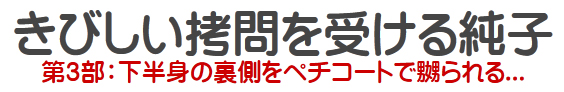 | 「中林純子!午後3度目の拷問の時間だ。立て!」...純子は手錠をかけられて檻から出されました。 ああ...みんなの前を引き回されるという辱めも兼ねて、鞭で追われながら拷問室に連行される純子です。 拷問は竹刀で突かれたり鞭で打たれたり熱蝋責めや水責めのような苦痛を主眼とするものとは限りません。この時のように羞恥心を嬲られることも... ![]() 純子の足首が縛られ、その縄尻が首輪にロックされてしまいました。とっても恥ずかしい格好を強制される純子...前にも同じ責めを受けました... ![]() 2012年のその時は、膝下で縛られ、その縄尻を首輪に繋がれました。そして敏感な所を手指で嬲られたの...いやらしい動きときびしい責めで... ![]() 今回はペチコートで敏感なところを嬲られました。ああ、気持ちい...もっと...そう思っているときびしいスパンキングが同じ敏感な所を責めるのでした。 ![]() ペチコートの愛撫とスパンキングの苦痛が純子の頭の中でないまぜになります。もう分けられない...苦痛と快楽...ああ、もっと虐めて下さい... ![]() こんな破廉恥な自分いじめまで公開させられる性奴隷の純子...醜悪な変態女装マゾ!...こんな純子にはやっぱりきついお仕置きが必要ね! |