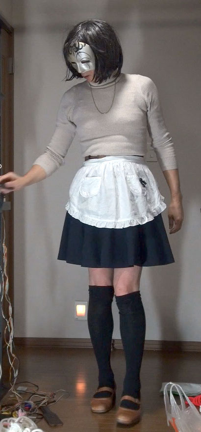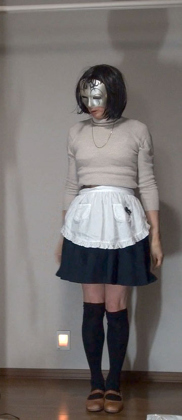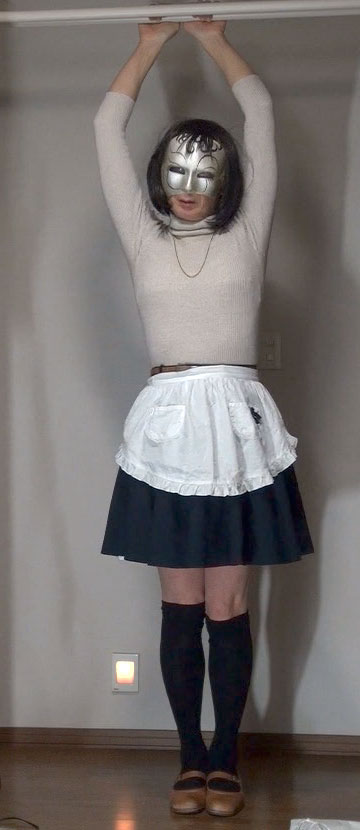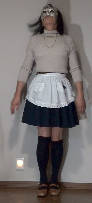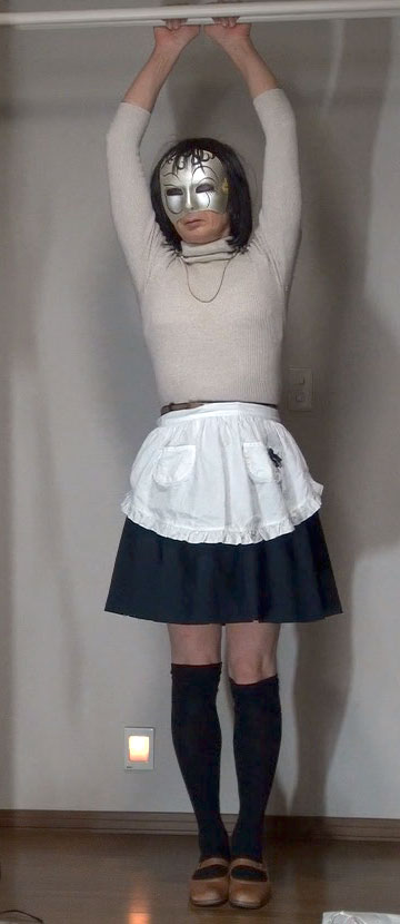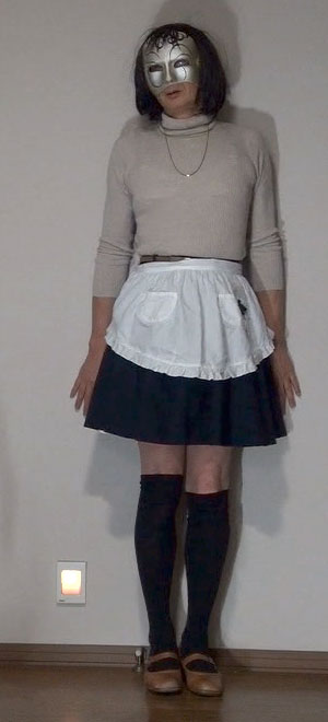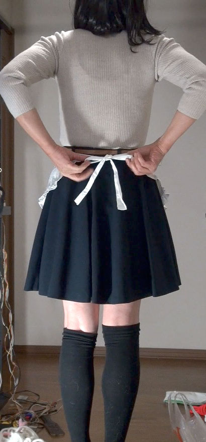 このスカートにもエプロンを合わせてみました。紺無地のフレアーミニだから、メイドのようだわ。メイドとして酷使されながら性奴隷として調教される純子!