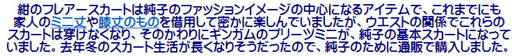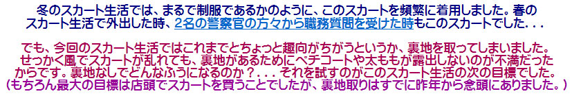 ![]() いよいよ実地で試す時がやって来ました。今日は風がとても強いことが部屋の窓から外を見るだけで分かりました。来てみると、すごい風...怖くなってしまうくらいでした。 ![]() ここは去年、いいえ一昨年の暮れに同じフレアーミニ姿で撮影した所...あの時は裏地がスカートの中をしっかり守ってくれたので、ほとんどペチコートが見えませんでした。 ![]() 裏地を取った効果はほんとにすごかったです...ご覧のようにちょっと風が吹くだけでスカートはやすやすと捲れ上がり、その下のペチコートがはっきり見えてしまいます。 ![]() 上は風に吹き曝される場所だったので、スカートはどちらかというと捲れ上がるよりからだにピタッとくっついてしまって...それでも裾の乱れには激しいものがありますが... |