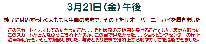 この時、純子は白レースの股割れパンティでした。水平になるまで捲れ上がるスカートがどれほど心細い...恥かしい衣装であるか...お分かり頂けますでしょうか?