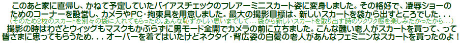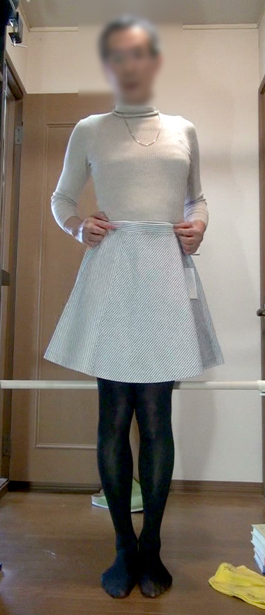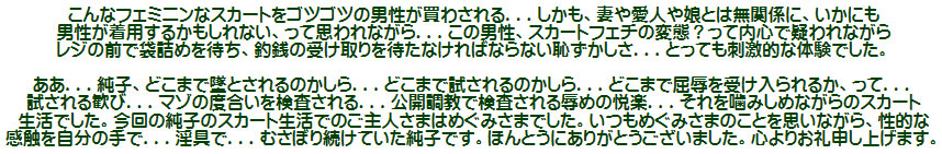 これまでのバイアスチェックのフレアーミニスカート姿に変身してカメラの前に立ち、さっき買ったスカートを袋から出してみる純子です...ああ、これ...